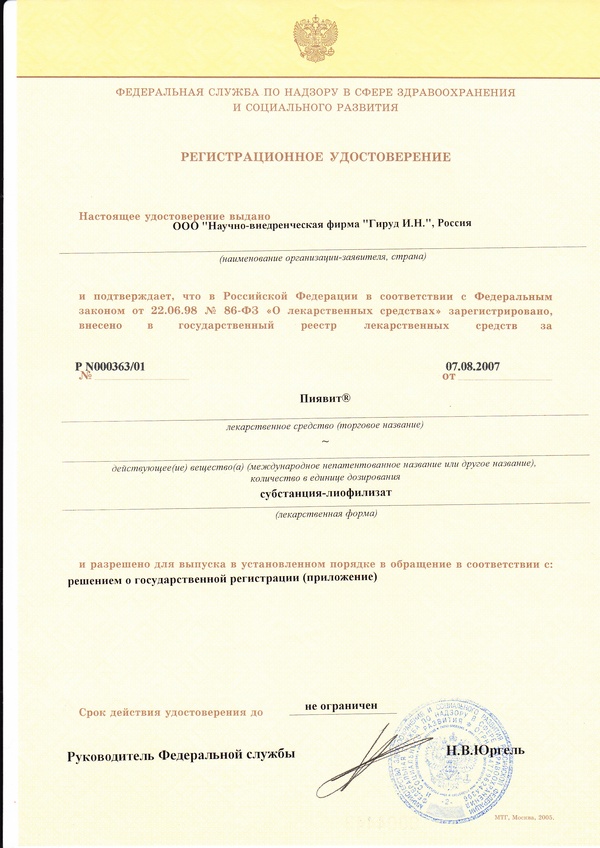 Регистрационное удостоверение о государственной регистрации лекарственного средства Пиявит